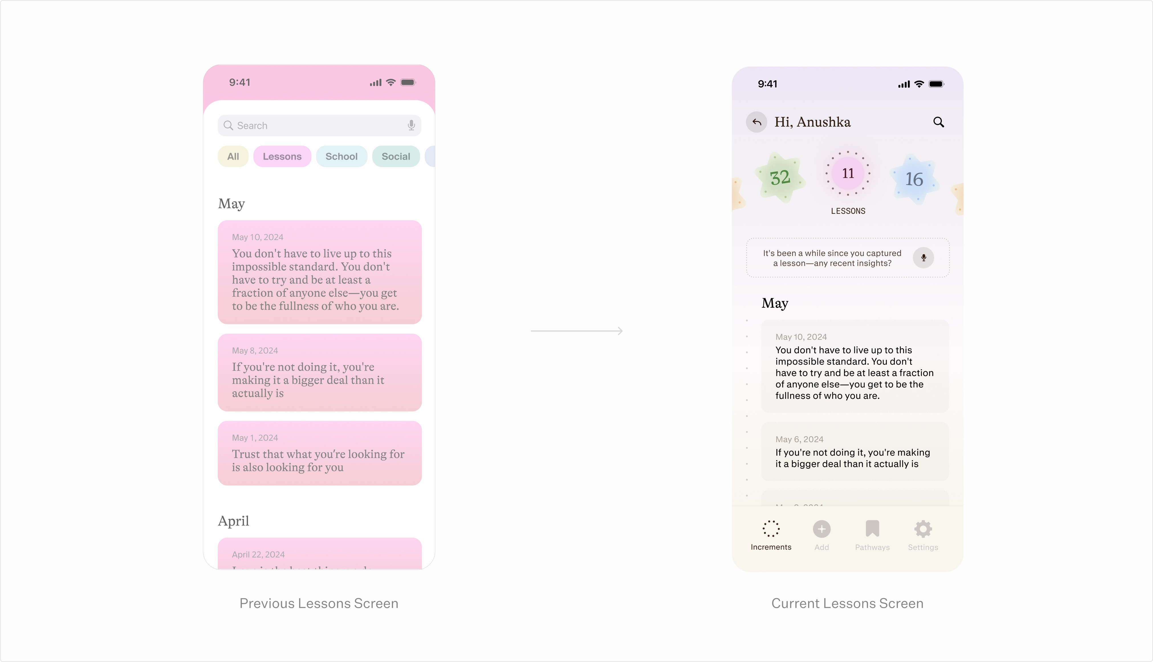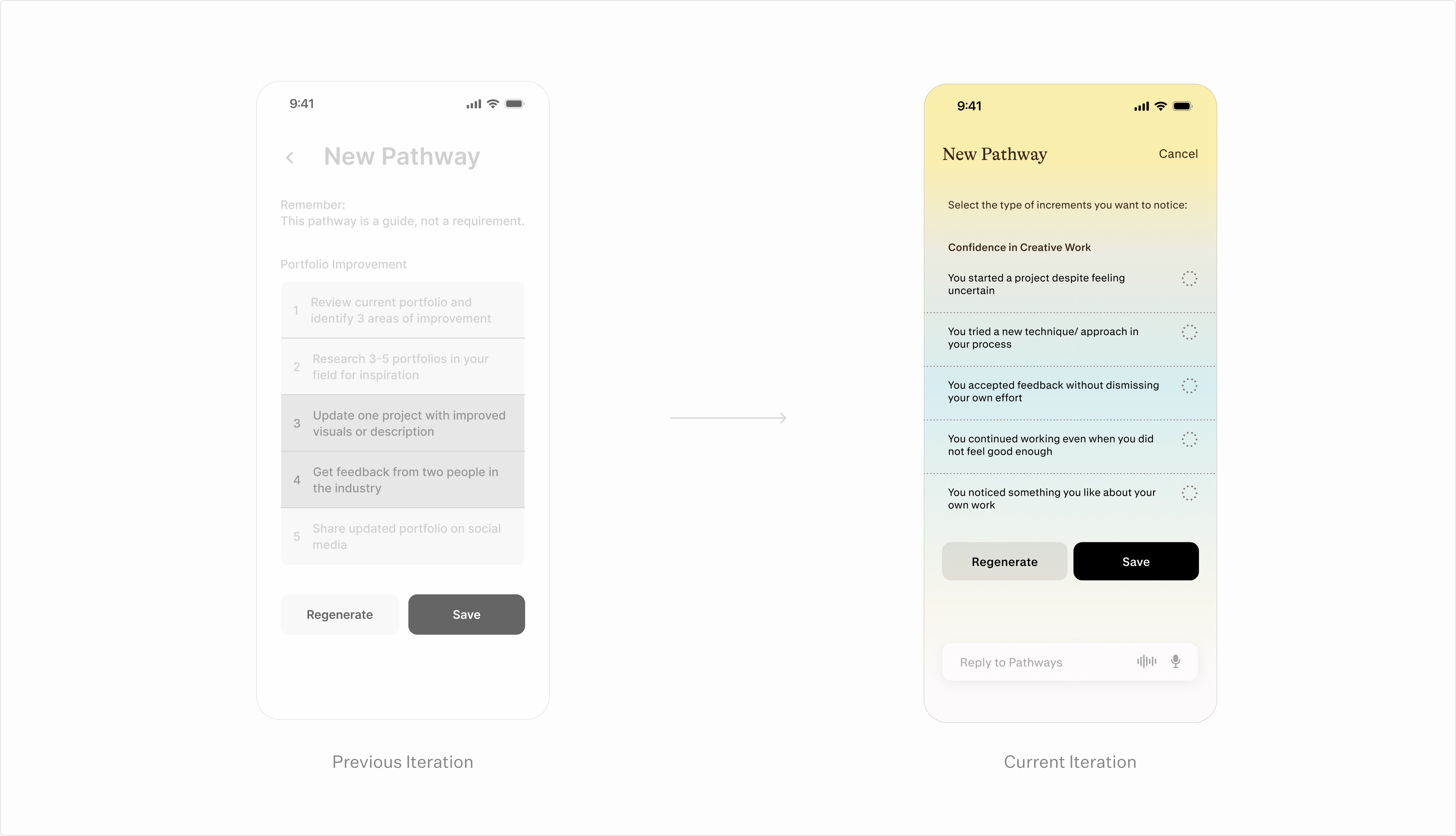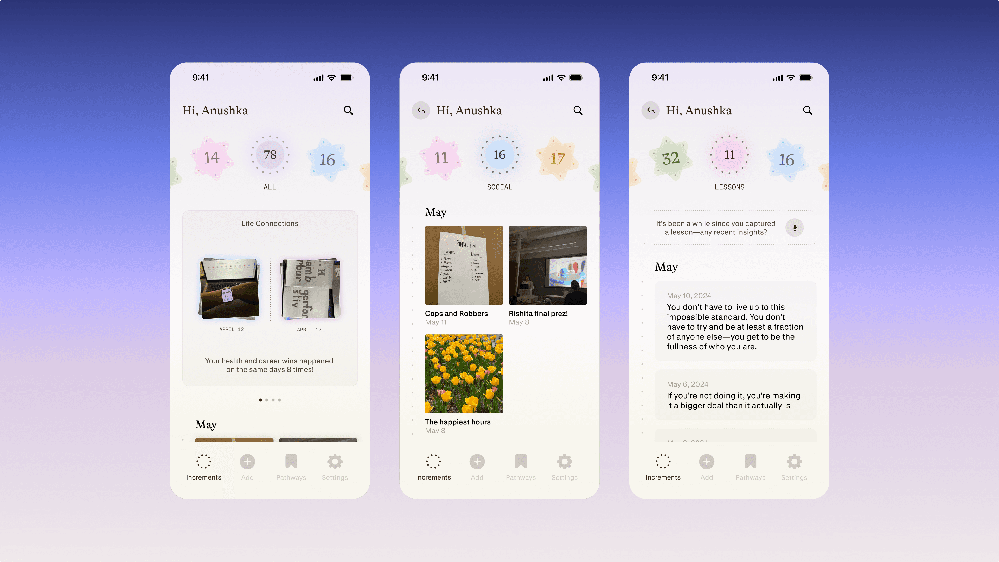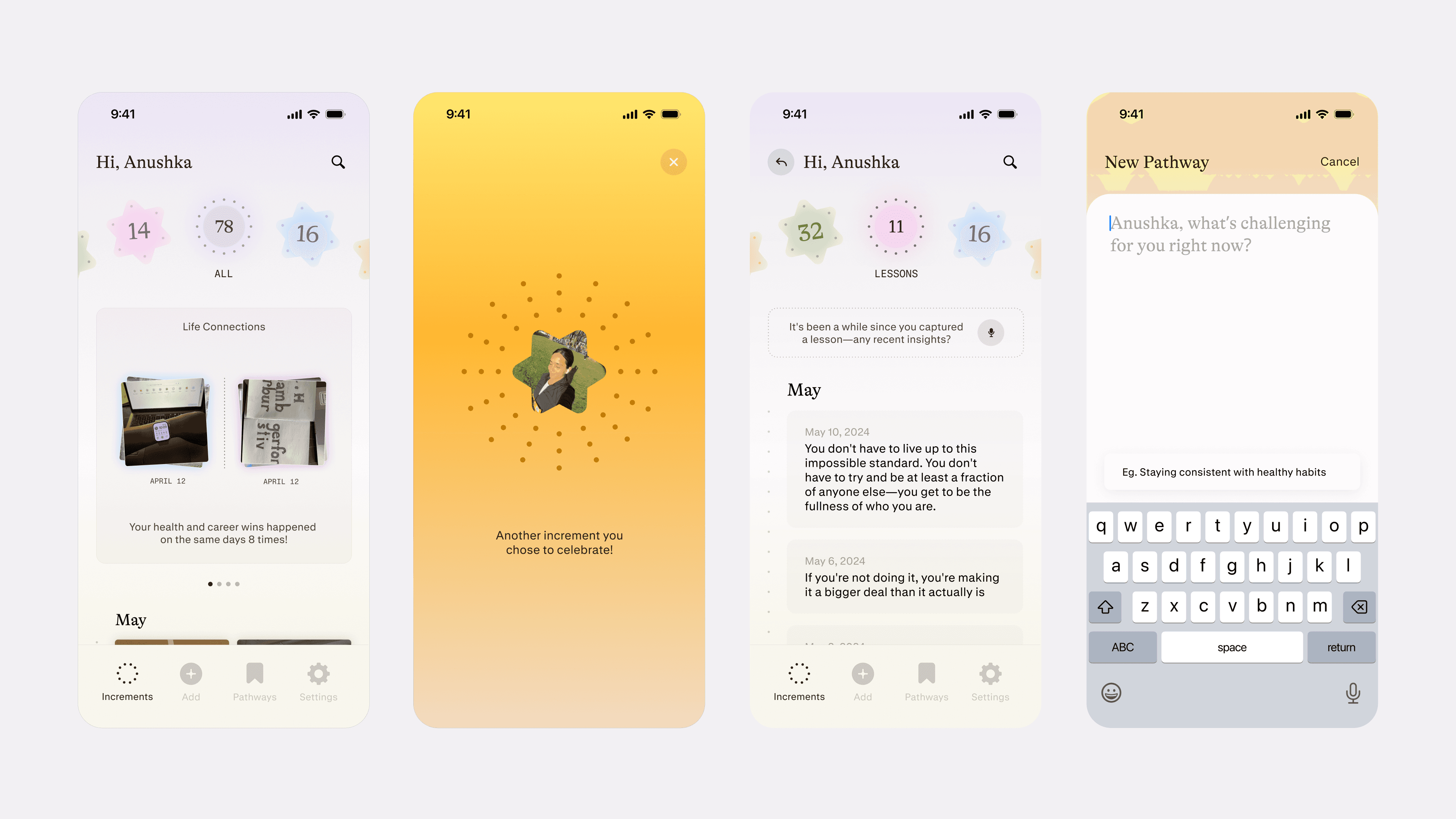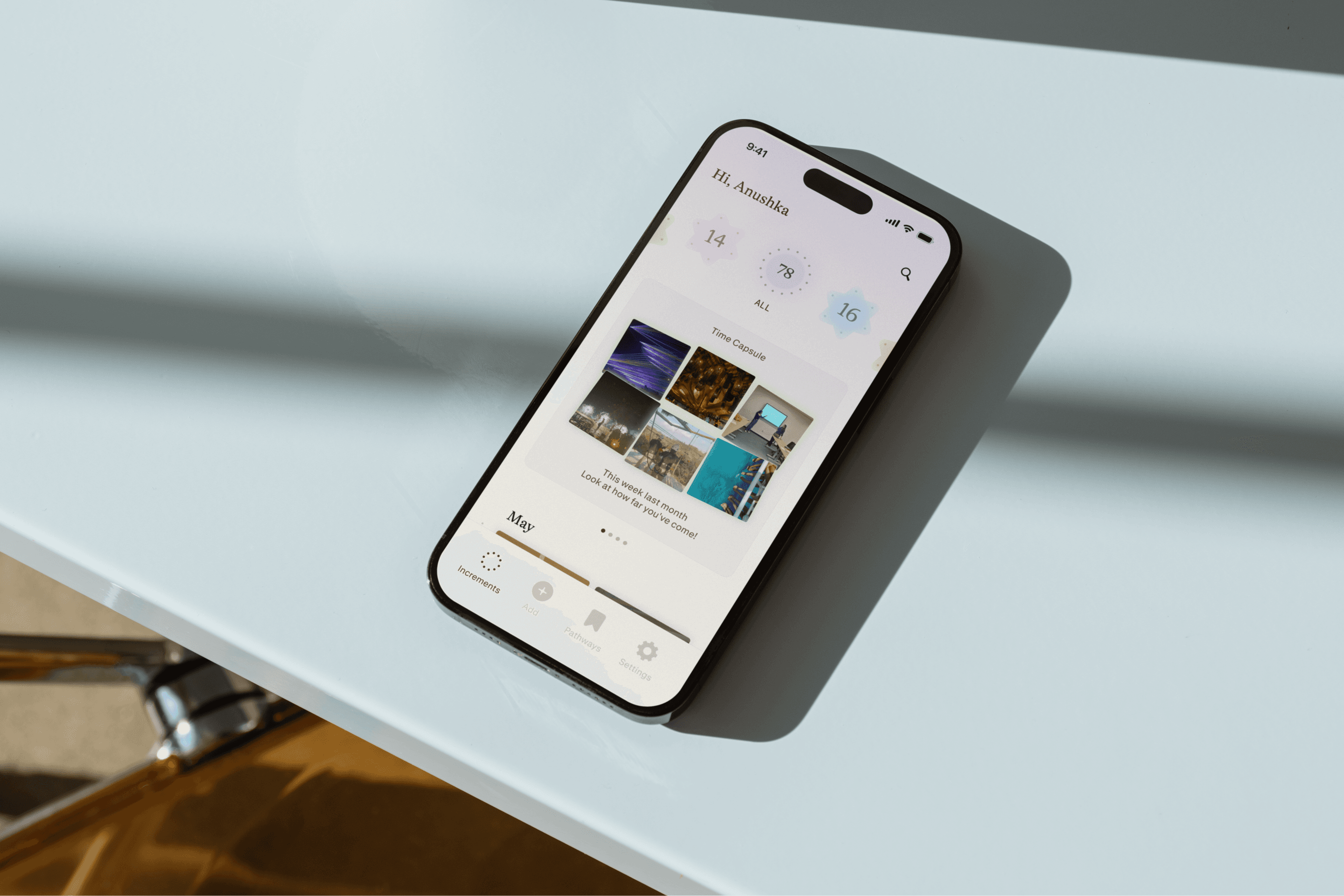 PAT research shows that narrative construction around experiences creates lasting positive affect (happiness!). By leveraging this, the app helps users build a personal reflection repository alongside momentary celebrations.